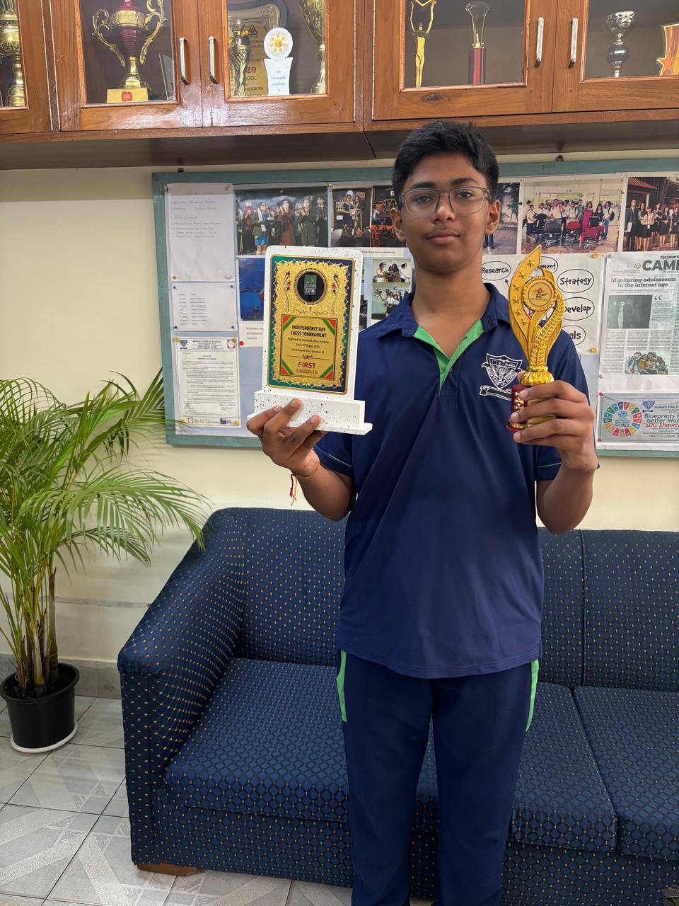 Yatharth Agrawal Class 8 won the First Prize in Under 15 category in the Independence Day Chess Tournament and 5th prize in the Chess Conclave Invitational Cup Under 15 Boys.